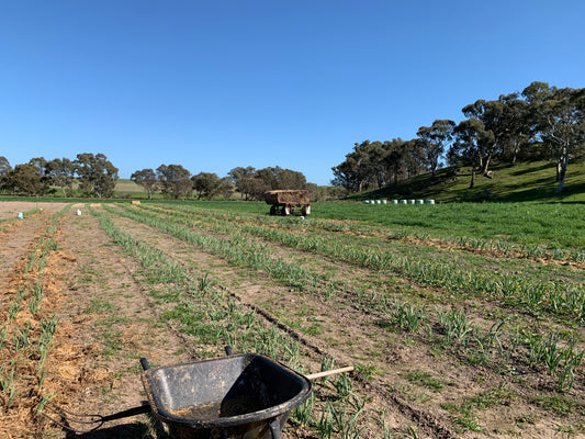 We are a small family farm based in central Victoria. The farm has been in our family since 1926. We have been growing garlic in a commercial capacity for past 5 years. Our garlic is grown along side Joyce's creek. We use rotational grazing principles, compost, wheat straw and reusable drip irrigation to maximise water use efficiency and increase soil carbon, with seaweed and worm juice to improve soil quality. We aspire to use regenerative principles as much as we can and keep waste to a minimum with the focus of delivering our best quality produce to our customers. We are increasing our number of varieties and the products that we offer. We currently offer 5 varieties of garlic for culinary use and/or seed stock for growing.